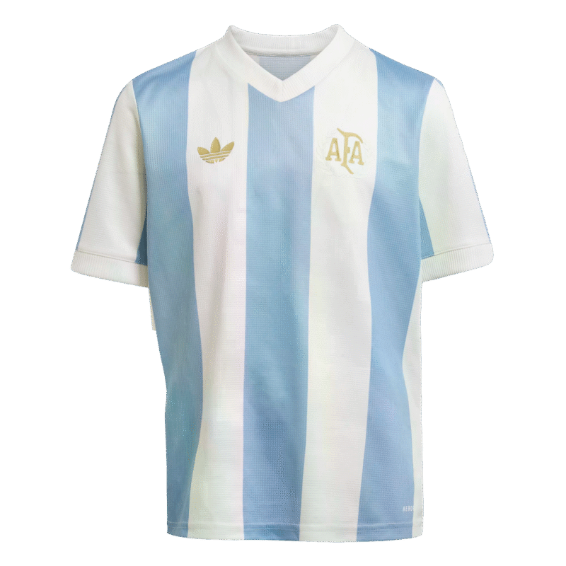 Part of a special kit that marks the 50th anniversary of Argentina and adidas first joining forces. This kids’ soccer jersey rolls back the years with an iconic Trefoil and mid-’70s-inspired team crest standing out in gold colors over those famous stripes. Moisture-managing AEROREADY will keep them focused on the action. while a special sign-off captures the feeling of supporting Argentina.
