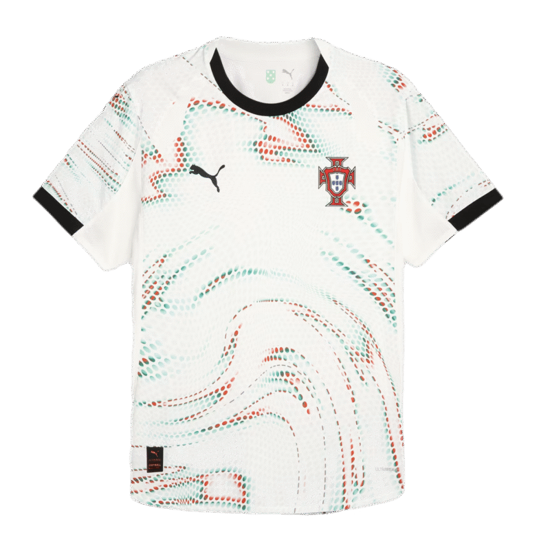 The future shines brightly in the Portugal Away Kit. Bold graphics with red and green highlights are brought to life with motion to celebrate the intersection of art. technology. and soccer in modern-day Portugal. The match-ready. Authentic version of the jersey is made with PUMA’s ULTRAWEAVE fabric and features an athletic fit for elite-level performance. Mark the new era.