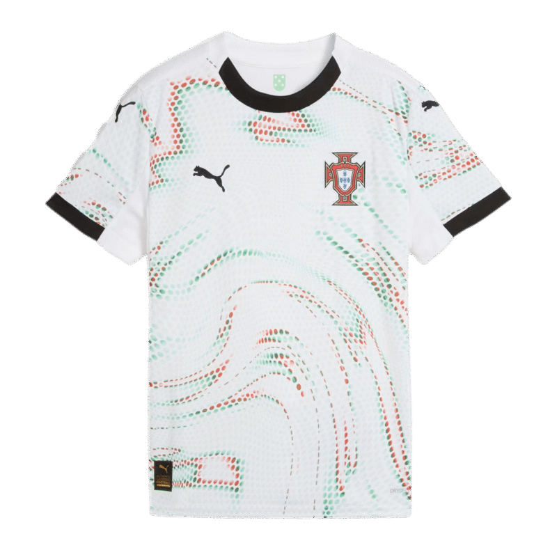 The future shines brightly in the Portugal Away Kit. Bold graphics with red and green highlights are brought to life with motion to celebrate the intersection of art. technology. and football in modern-day Portugal. Designed for the young fans. this jersey pairs the same match-worn look with a casual silhouette. details. and materials. ideal for both game day and everyday wear.