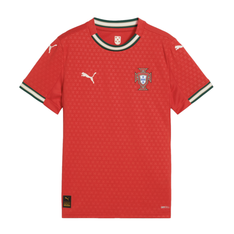 Tradition fuels ambition in the first-ever Portugal Home Kit by PUMA. With signature Portuguese colors and repeated graphics of the Quinas emblem from the national coat of arms. it’s a kit that pays tribute to the brilliant past. while setting the stage for the next generation to shine even brighter. Designed for the young fans. this jersey pairs the same match-worn look with a casual silhouette. details. and materials. ideal for both game day and everyday wear.